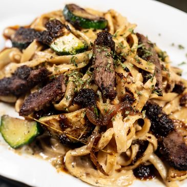 Zuchinni, squash, tri-colored peppers in our homemade Jerk cream sauce