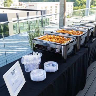 Upgrade your catering with our stainless steel rentals. We can set up your buffet using our stainless steel chafer set, coffee dispensers, table linens, servers, full bar etc.
